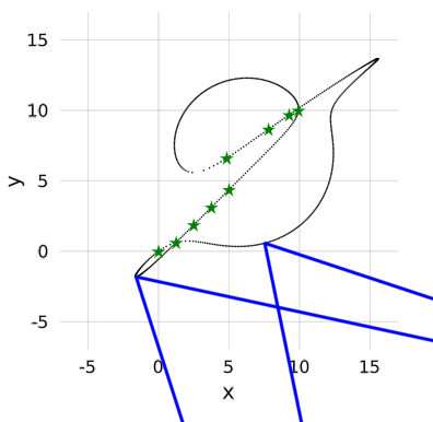 In the next step we turn our problem around. Instead of looking for the precision points we act as if we picked these precision points and wanted to find all other four bars whose coupler curves move through these precision points. Wampler et. al. showed that there are $6 \cdot 1442 = 8652$ solutions for this polynomial system.