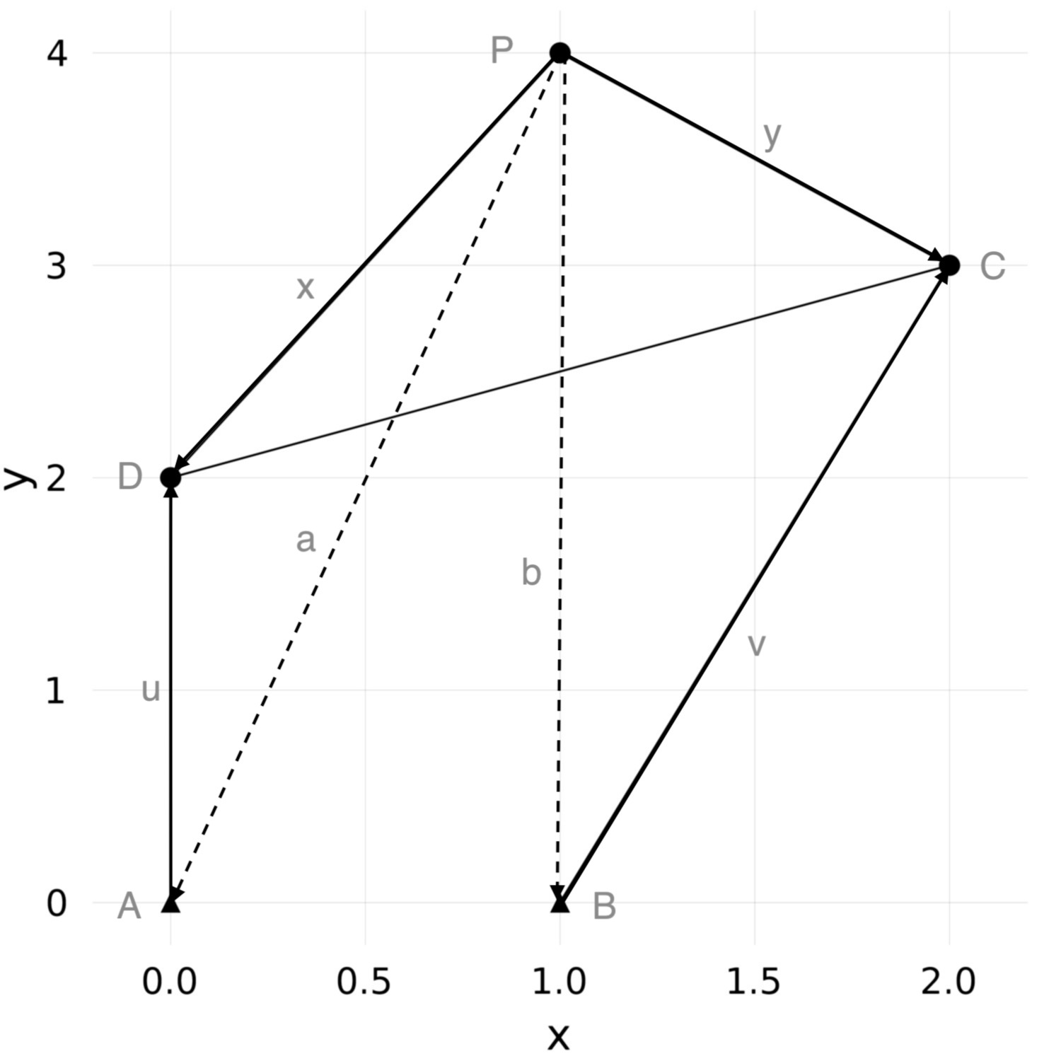 Let $\lambda$ and $\mu$ denote the rotation of bars $u$ and $v$ and $\theta$ denotes the rotation of the coupler triangle $CPD$, as shown in the next picture.